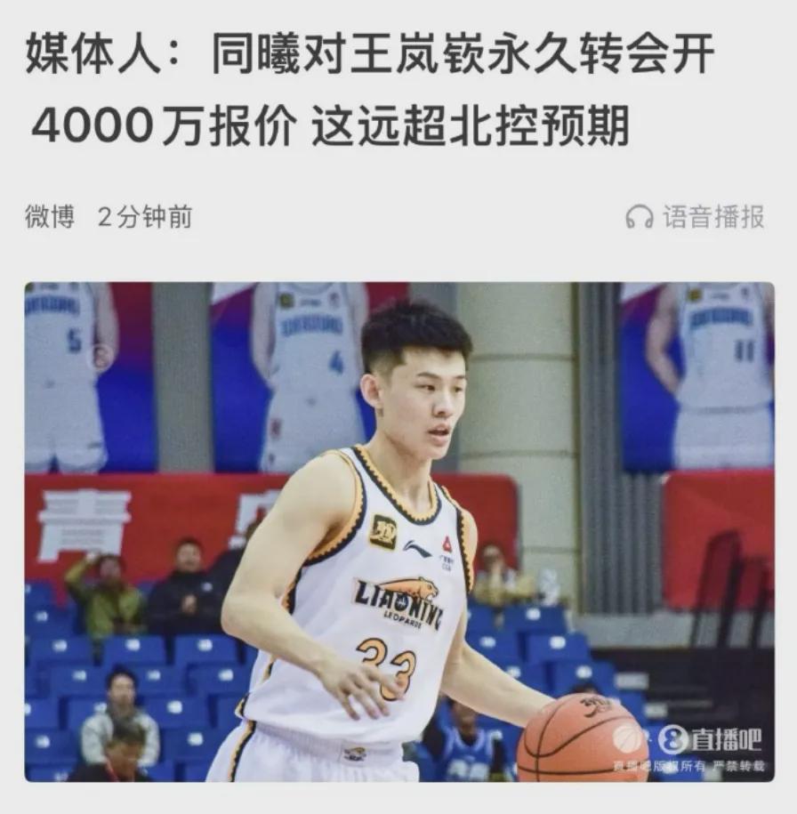 据报道,这是因为同曦男篮开出了4000万元的转会费,北控男篮认为价格太高了,王岚嵚不值得这个价,于是最终没有完成交易。